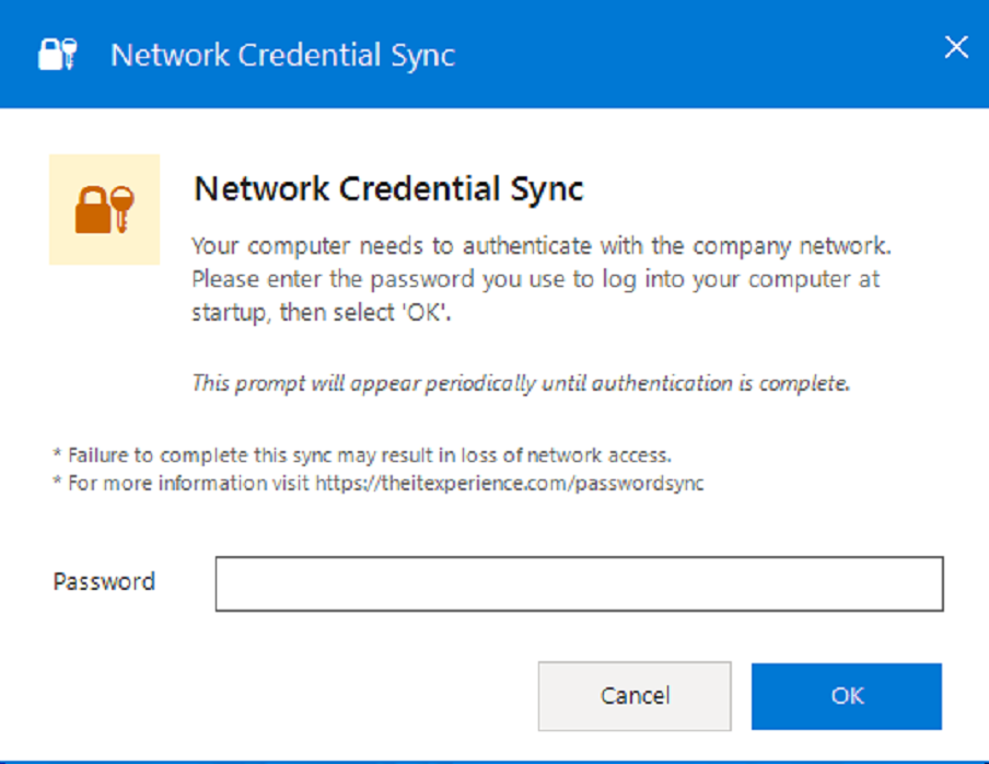To maintain network security, you may be prompted to enter your computer password for authentication. This occurs automatically when your system hasn't synced in over 7 days, or when IT support needs to synchronize your credentials.
